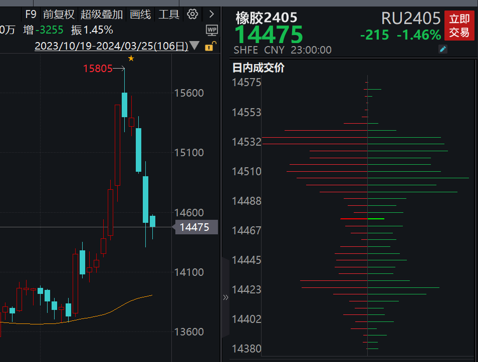 3月22日,天然橡胶期货主力合约低开低走,收盘跌4.57%。3月22日晚间,期价继续下探,报收14475元/吨,基本回吐之前的涨幅。