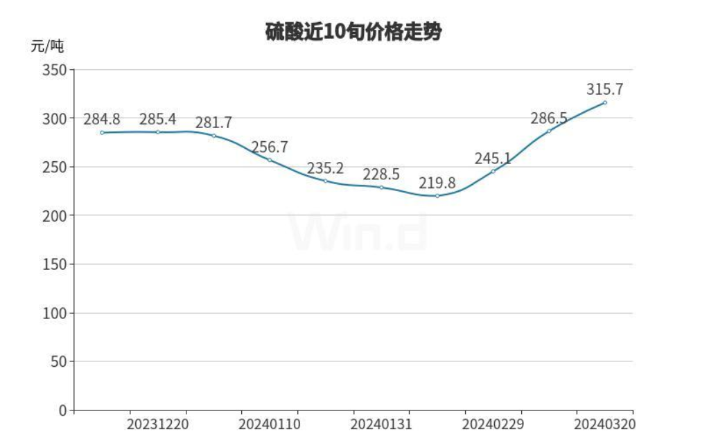 3月份,硫酸供应端利好明显,硫酸价格继续上行,较2月初的低点价格已涨超40%。