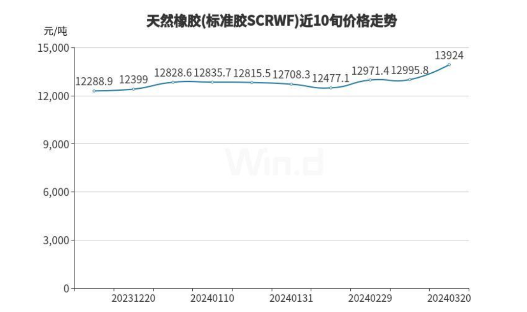 据国家统计局数据,截至2024年3月中旬,天然橡胶(标准胶SCRWF)流通领域价格环比上涨7.14%,报13924元/吨,创2022年1月中旬以来新高。
